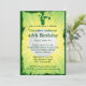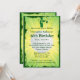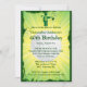 Você pode personalizar todo o texto deste convite de aniversário de 40° golfe. Você pode mudar o texto e o número na frente e usar isso para um aniversário de 50, 60 anos, 70 ou outro. O design apresenta um fundo brilhante amarelo e verde de explosão solar com uma grande bola de golfe central branca e uma imagem de um golfista com camisa de xadrez e um chapéu, segurando um clube no ombro. Verde, amarelo e branco.