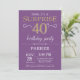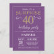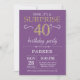 Convite para aniversário de 40 anos surpresa com fundo brilhante roxo e Dourado. Aniversário Adulto. Homens ou Mulheres no Dia Convidam. Qualquer idade. Para mais personalização, clique no botão "Personalizar" e use nossa ferramenta de design para modificar este modelo.