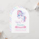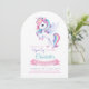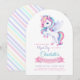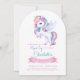 Convite a uma festa de aniversário mágica com um adorável unicórnio com asas nas nuvens sobre fundo arco-íris.