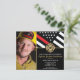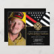 Este design apresenta uma bandeira de bombeiros com listras pretas e brancas, e uma fina faixa vermelha também. "Parabéns" e o crachá de bombeiros se senta acima de todos os detalhes da festa para o bombeiro aposentado, tenente ou festa de aposentadoria do chefe. Os convites também podem ser personalizados para um formando da academia de bombeiros. Personalize ainda mais esta design com uma foto do bombeiro aposentado.