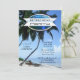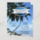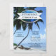 Convite de festas de aposentadoria com cadeiras de salão em uma praia tropical com palmeiras. Perfeito para quem quer que esteja ansioso por uma pensão relaxante. Se você não precisa da imagem estilizada superior sobre as árvores, você pode copiar a imagem de trás e colá-la à frente.