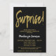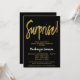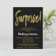 Um elegante, moderno convite de festas de aposentadoria surpresa preto e ouro. Texto do script de visão na parte superior e texto dourado abaixo com o nome em branco sobressalente