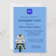 Convite de aposentadoria para um policial aposentado. Design tem uma moto policial e um policial com as palavras que você é convidado para uma festa de aposentadoria. Coloque as iniciais do seu departamento de polícia no crachá no topo do convite. Fácil de personalizar com os detalhes da sua festa.
