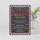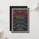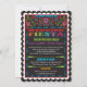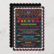 Convite para apresentação do Fiesta Wedding Mexicano com borda escalada. Super bonitinho e colorido para o casal que está no casamento tem um sul do chefe, sentimento mexicano, perto de um feriado mexicano, um casamento poste ou um casamento de destino. Inspirado por banners picado de lapela, este convite apresenta corações decorativos e flores e designs e banners astecas em cores brilhantes, todos em fundo preto. Ilustração desenhada à mão, meu McBooboo.