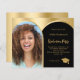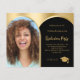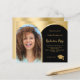 Adicione sua própria foto vertical do formando. Um quadro fotográfico em forma de arco dourado falso. Uma cor falsa de ouro e fundo preto. Personalize e adicione um nome e detalhes da parte. 1 folha = 1 convite impresso de borda a borda.