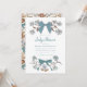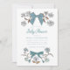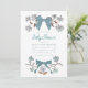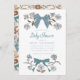 Cartões de convite para chás de fraldas do tema do arco coquette com ilustração desenhada à mão de fitas e flores em cores azuis.