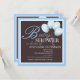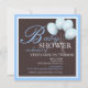 Um convite de chá maravilhosamente elegante apresenta um doce buquê de balões azuis de bebê em um rico fundo de chocolate escuro marrom - perfeito para a futura mãe que está esperando um menininho. Um poema bonito nos convidados do vamos traseiro sabe sem dúvida que todo esse azul é para o bebê que é esperado. "Pequenos bocejos e suspiros sonolentos, rimas de berçário e labiadas, a caminho está um bebê doce, vamos se junta e chá com alegria"