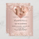 Para uma elegante Quinceañera, 15. Um fundo rosa dourado. Decorado com ouro rosa, faíscas cor-de-rosa e balões. Personalize e adicione um nome e detalhes da festa. O nome é escrito com um script de estilo manuscrito, número 15 com fontes de estilo de balão.