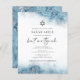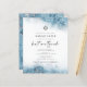 Este elegante convite do morcego mitzvah apresenta um design de borda azul-clara de aquarela imitando o mármore veinado com folha de prata falsa, desaparecendo gradualmente no fundo branco. As palavras "bat mitzvah" aparecem na escrita manual de cinzas de carvão, com o texto remanescente em maiúsculas de serif. O padrão de mármore azul e prateado é repetido na parte traseira do cartão.