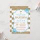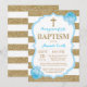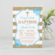 Convite para Batismo Azul e Dourado. Batismo Menino. Primeira comunicação. Cristo. Dedicação Infantil. Douradas e White Stripes. Flor Floral Azul. Para mais personalização, clique no botão "Personalizar" e use nossa ferramenta de design para modificar este modelo.