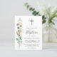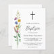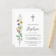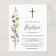 Este convite batismo orçamental é decorado com flores silvestres e uma cruz. Facilmente personalizável. Original Watercolor © Michele Davies.
