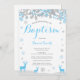 Convite De Batismo Para O Rapaz De Veado De Inverno. Floco de neve branco e azul. Batismo Rapaz.Primeira Comunhão. Natal. Dedicação de Crianças. Fundo Branco.