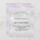 Um convite de aniversário moderno, elegante e minimalista. Fundo metálico de aspecto fino prateado, decorado com poeira de cinza púrpura e poeira brilhante e uma borboleta como marca de água. Personalize e adicione seus nomes e detalhes do casamento. Letras pretas coloridas.