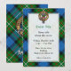 Brasão do clã Ferguson rodeado por uma alça e fivela sobre um fundo de tartan. Texto personalizado em ambos os lados.