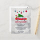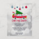 Cartaz de convite de festas de Natal com um carregando vermelho legal, um pinheiro de natal verde no seu telhado e um presente guardado no porta-malas aberto. Bolas de Natal, flocos de neve e estrelas penduradas no topo. Colocado sobre um fundo prateado com estrelas na moda espalhadas por aí. Tem um belo estilo retro-anos 50.