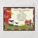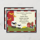 Este convite à fazenda do país tem ovelhas mães e bebês, pintinhos, uma vaca, um celeiro vermelho com girassóis atrás e na boca de ovelhas mãezinhas. O sol está subindo no fundo com uma armação de listras vermelhas e brancas com preto no topo.