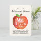 Um convite personalizado apenas para o professor, diretor ou profissional de educação. Apresenta um estilo de pintura de abstrato Apple em direção ao centro que contém o nome da pessoa em questão. No verso estão as listras verdes e brancas. Pode ser usado para comemorar a aposentadoria de um professor ou a introdução à profissão de professor.
