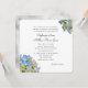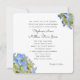 Convites de casamento florais azuis. Cartões quadrados modernos com bonito drangeas azuis nos cantos e um design floral branco ao contrário. Texto impresso preto com modelo no topo para os pais da noiva, que estão convidando convidados. Adiciona também pais do noivo com linha de "filho de". *Deixe um espaço entre linhas impressas de texto para replicar esta aparência.