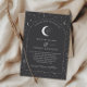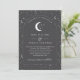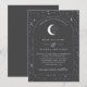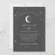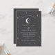 Uma lua celestial e um convite de casamento estrelado com uma cinza de carvão e um texto branco com elementos. Personalize a cor do padrão estelar, fundo, preenchimento de arco e elemento lua!