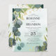 Convites de casamento orçamentários com um pano de fundo de lavagem de aquarelas desbotado, elegantes folhas botânicas de eucalipto verdes, salpicos de folha de ouro falsa, e um simples modelo de casamento que é fácil de personalizar.