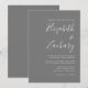 Este simples convite de casamento moderno mostra um texto branco sobre o fundo da cinza. Adicione os nomes da noiva e do noivo na caligrafia de escrita manual do na moda e os detalhes na fonte sans serif. O reverso é uma sombra correspondente de cinzas sólidas.