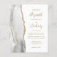 A borda esquerda deste elegante convite de casamento moderno apresenta uma cinza e uma aquarela branca, aparada com falsa brilho dourado. O texto personalizável combina manuscrito, copperplate e fontes itálicas em cinzas de carvão em um fundo branco. O verso apresenta uma cinza correspondente, design de agate branco e ouro.