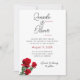 Simples convite de casamento rosa vermelha com nomes no topo. Três rosa vermelha no canto inferior são o único white paper simples e comum sobre design, com opções de upgrade. Cada caule de rosa tem uma floração parcialmente aberta, com verde. Os primeiros nomes da noiva e do noivo estão em um script grande e manuscrito na parte superior da carta. Cada sobrenome pode ser adicionado, na impressão em maiúsculas vermelho escuro, sob cada nome. Deixe isso fora se quiser. O texto do convite é preto, impresso com data de casamento em vermelho. Um modelo para a recepção de informações está no fundo. O reverso é vermelho escuro sólido. Uma design romântica e bonita para o casal moderno no amor. Esta design trabalha para uma grande celebração elegante ou para um pequeno casamento no quintal. Escolha um documento especial para realmente fazer este convite atordoante.