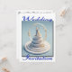 Convite de casamento com um casal 3D mostrado dançando em seu bolo - O cartão está em azul com um círculo por cima do casal. Você pode mudar a parte de trás do cartão para as informações do seu casamento relevantes para a cerimônia ou esquema de cores ou direções para o local. O escrevendo está em azul para ir com azul mais claro do cartão.