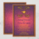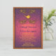 Um convite de casamento divertido e colorido com uma abajur árabe mágica e detalhes do ornamentado. O convite é um gradiente roxo e cor-de-rosa com salpicos de ouro. O convite está enquadrado em fazer de ouro, é divertido, mas sofisticado.