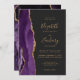 A borda esquerda deste elegante convite de casamento moderno apresenta uma cor d'água roxa, borda agitada, aparada com falso brilho dourado. O texto personalizável combina manuscritos dourados, copperplate e fontes itálicas em um fundo de cinza de carvão escuro. O verso apresenta um design de agate roxo e dourado correspondente.