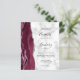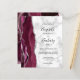 A borda esquerda deste elegante convite de casamento moderno apresenta uma cor d'água borrifada com borda cortada com cintilação falsa de prata. O texto personalizável combina manuscritos, copperplate e fontes itálicas em preto em uma cinza e fundo de mármore branco. O lado inverso apresenta um design de burgundy e agate prateado.