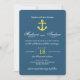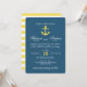 Convide amigos e família para o seu casamento com um belo convite para o casamento, marinho náutico e âncora amarela. O convite náutico apresenta uma fonte elegante, um fundo marinho, âncora amarela e listras amarelas e brancas no verso.