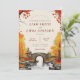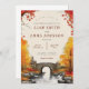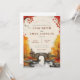 O Convite para casamentos outono apresenta árvores de queda de aquarela e uma ponte de pedra velha olhando sobre um rio e caindo cheia de pedras.
