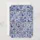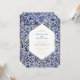 Este design apresenta padrões azulejos portugueses russos. O texto do casamento é elegantemente enquadrado com uma forma geométrica branca e dourada. Design de convite para casamento floral único Azulejo azul e branco com elementos modernos. Também estão disponíveis itens de papelaria de casamento e outros formatos de convite de casamento.