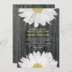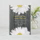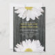 Um simples convite de casamento com margaridas a espreitar de cima e de baixo. O fundo é lenha. Personalize o texto correspondente no centro com detalhes do seu casamento. O lado oposto apresenta um plano de fundo de madeira de casca. Personalize com os nomes da noiva e noiva sobre o monograma. Papel Reciclado. A redação é da noiva e do noivo junto com seus pais.