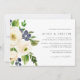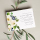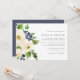 Nosso convite para o casamento do Blueberry Lane mostra seus detalhes do casamento alinhados à direita, acentuados por flores de aquarela de indigo e marfim, mirtilos e folhagem verde.