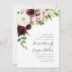 O convite para o casamento floral elegante e moderno apresenta uma cascata de rosas de aquarelas e peônias em marfim, rosa-pincel e marsala-burgundy, com botânicos verdes e folhagem exuberantes. Os detalhes do seu casamento estão alinhados à direita em elegantes letras escura e escura, acentuadas com o roteiro escrito à mão.