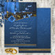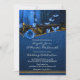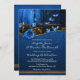Um convite elegante para o casamento, com uma floresta encantada com luzes festivas de fadas e borboletas em azul-da-noite.