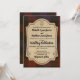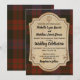 Fundo de xadrez de tartan castanho com fundo de papel rústico e sotaques de aço escocês. crachá de clã marrom no topo, e personalize com as informações para seu dia especial!