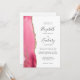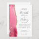 A borda esquerda deste elegante convite de casamento moderno apresenta uma coloração d'água rosa, borda agitada, aparada com falso brilho dourado. O texto personalizável combina manuscrito, copperplate e fontes itálicas em cinzas de carvão em um fundo branco. O verso fornece espaço para detalhes do casamento em um fundo branco sólido, junto com um código QR que os convidados podem digitalizar para visitar seu site e RSVP, o que economiza o custo de imprimir e enviar cartões RSVP separados.
