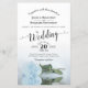 Este belo convite para o casamento apresenta uma design romântica com um solteiro longo e empalhado rosa azul pálido e poeirento sobre o seu lado e refletindo numa piscina de água. A tipografia apresenta caligrafia de script e um layout sofisticado. O dorso é uma cor púrpura clara marmoreada. Uma maravilhosa maneira de convidar seus amigos e família para compartilhar sua alegria em seu dia especial.