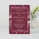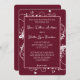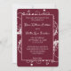 Ponha o tom para uma celebração de eterno com este Convite de Casamento de Flourish Vinho Vermelho. Apresentando floreados brancos graciosos, delicados elementos botânicos brancos e folhas brancas que fluem, essa design evoca uma estética feminina e macia perfeita para casamentos românticos. A escrita elegante se associa perfeitamente à tipografia moderna para destacar os nomes da noiva e do noivo e os detalhes essenciais do casamento. Ideal para temas clássicos ou inspirados no jardim, este convite traz sofisticação sem esforço para o seu dia especial.