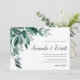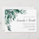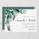 O convite de casamento botânico gráfico mostra folhas verdes de eucalipto exuberantes ilustradas em aquarela. Personalize com seus detalhes de casamento alinhados à direita em uma mistura de blocos tradicionais e tipos modernos de caligrafia. Cartões invertidos a verde florestal sólido.
