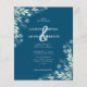 Convite para casamento moderno. Apresentando flores rústicas e minúsculas flores azuis sobre fundo azul Egeu. Fácil de personalizar com suas informações exclusivas.