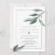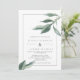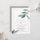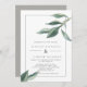 Um convite de casamento impressionante, com folhas de aquarela verdes detalhadas sobre fundo branco e fonte moderna e estrutura retangular da cinza escura. O suporte está em cinzas sólidas, mas isso pode ser removido.