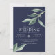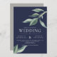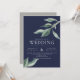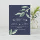 Um convite de casamento incrível para casais que buscam um visual moderno limpo, com folhas verdes a aquarelas sobre fundo marinho e fontes modernas brancas. O suporte está em cinzas sólidas, mas isso pode ser removido.
