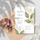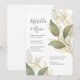 Folhas de aquarela lindíssimas em conjunto com as folhas de cor dourada mancham este moderno convite para casamento.