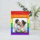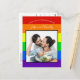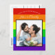 Este cartão postal ousado de convite de casamento listrado no arco-íris apresenta uma fotografia de noivado LGBTQ romântica personalizada para um casal ou lésbica que ama um anúncio brilhante e colorido listrado. Personalize este alegre cartão de fotografia LGBT Salve a data com os seus nomes, data e localização nas listras vermelha, laranja, amarela, verde, azul e roxa.