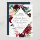 Nosso convite para o casamento do Radiant Bloom rodeia seus detalhes de casamento com um quadro geométrico de flores pintadas de aquarela em burgundy marsala, rosa-pincelado e azul-marinho, com folhagem verde de eucalipto. Uma escolha moderna, porém orgânica, em verde e branco, com botânicos luxuosos, coloridos e letras escritas à mão.