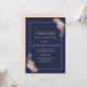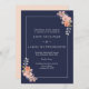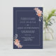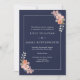Um convite de casamento bonito e sofisticado, com buquês florais de cor d'água em pêssego e azul com um fino quadro branco. O fundo do marinho faz com que este excelente caia ou casamento no inverno.